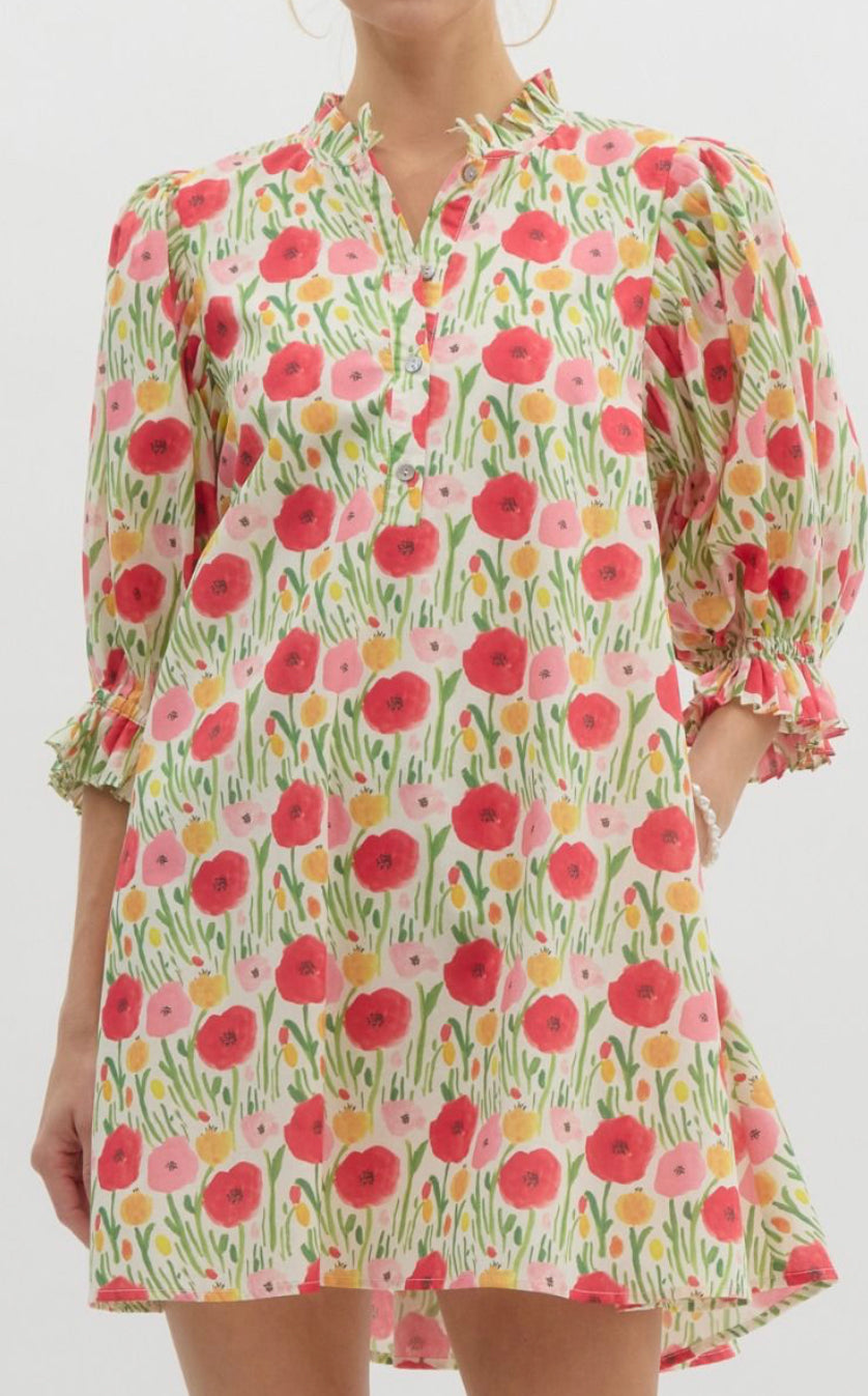Floral print elasticated ¾ sleeve pullover mini swing dress featuring adjustable back self waist tie. Front half-placket button closure below round ruffled neck. Pockets at side. Lined. Woven. Non-sheer. Lightweight.