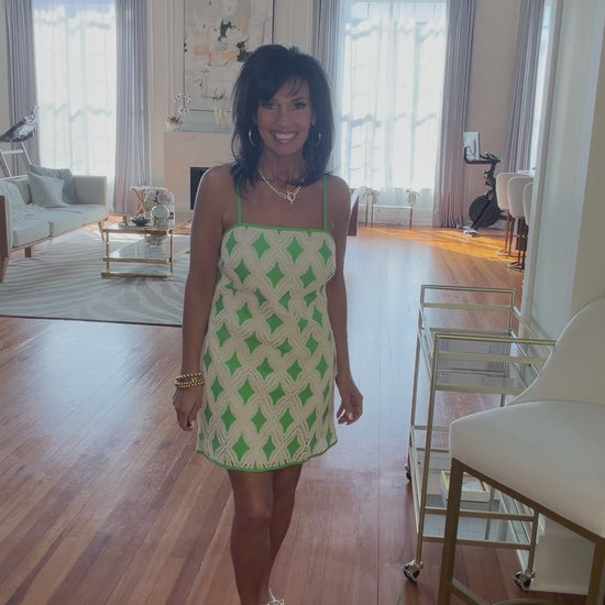 This gorgeous green shift dress brings together bold color and delicate texture for a look that’s both playful and chic. Featuring a beautiful cream lace overlay with a modern geometric pattern, it’s designed with slim spaghetti straps and a flattering straight silhouette that skims the body effortlessly. The vibrant green underlay adds a pop of color that makes this dress truly stand out.