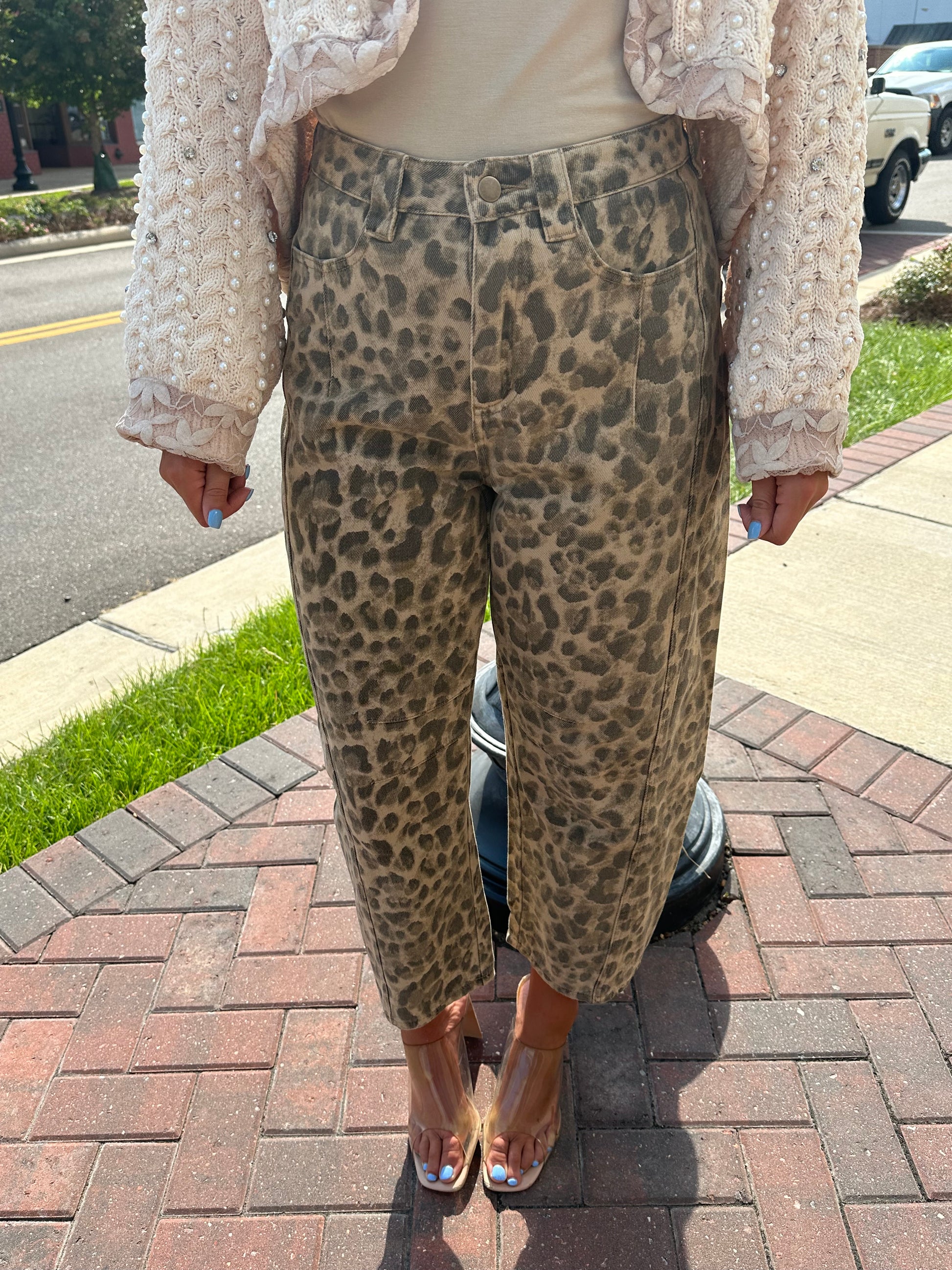 These trendy jeans feature a bold leopard print in earthy tones, making them a standout piece in any wardrobe. The relaxed fit adds comfort while maintaining a stylish silhouette, perfect for casual outings or dressing up for a night out. The unique pattern gives them a playful edge, ensuring you’ll make a fashion statement wherever you wish.