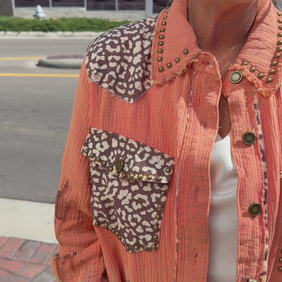 Turn heads in this bold Wild at Heart Studded Shacket! Featuring a fiery orange mineral-washed base with playful animal print accents, this piece blends western flair with wild energy. The distressed finish gives it that perfectly worn-in edge, while the brass studs add a touch of attitude along the collar, pockets, and trim. Soft, lightweight, and full of personality — it’s your go-to layer for fall adventures, concerts, or casual nights out.