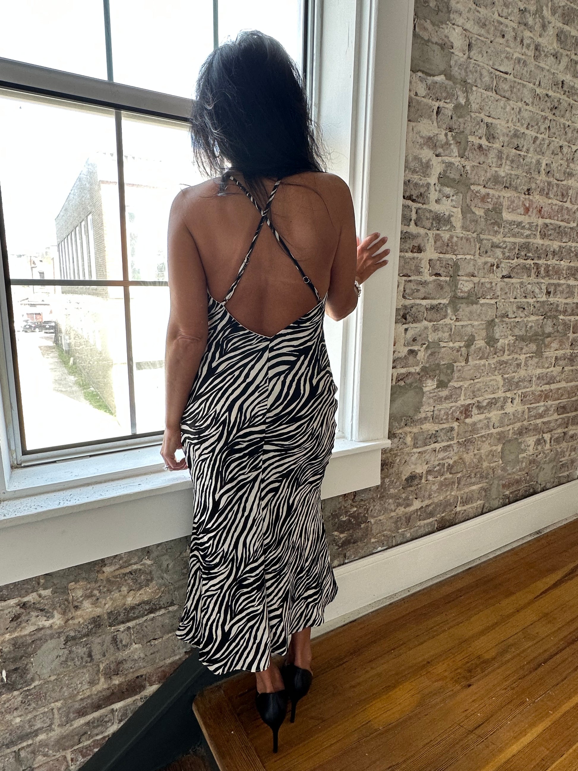 Wild Jungle Vibes Zebra Cowl Neck and Sexy Back Sleeveless Midi Dress
