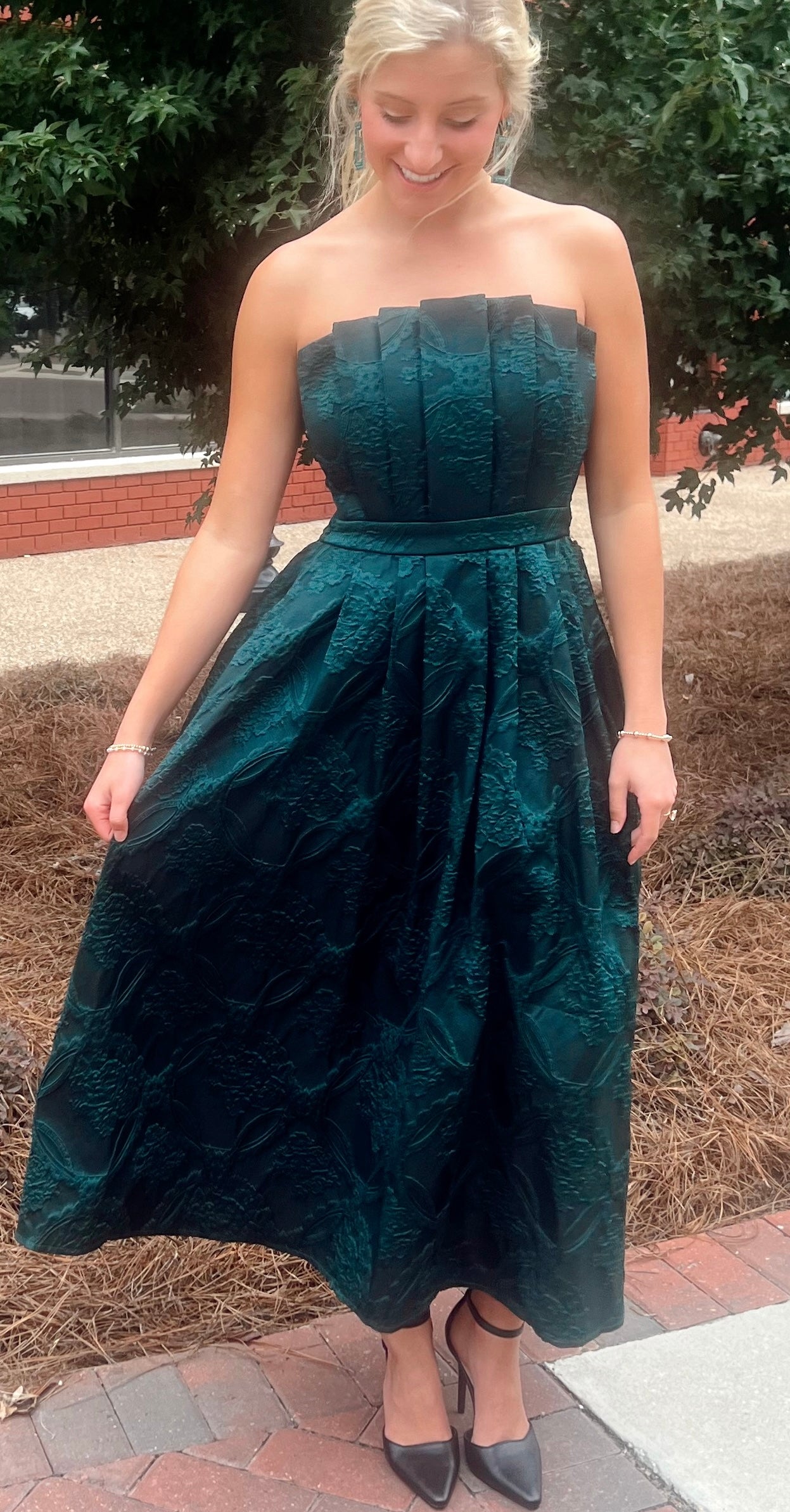 Strapless embroidered midi dress featuring pleated bust. Smocking and zipper closure at back. Pockets at side. Unlined. Woven. Non-sheer. Lightweight.
