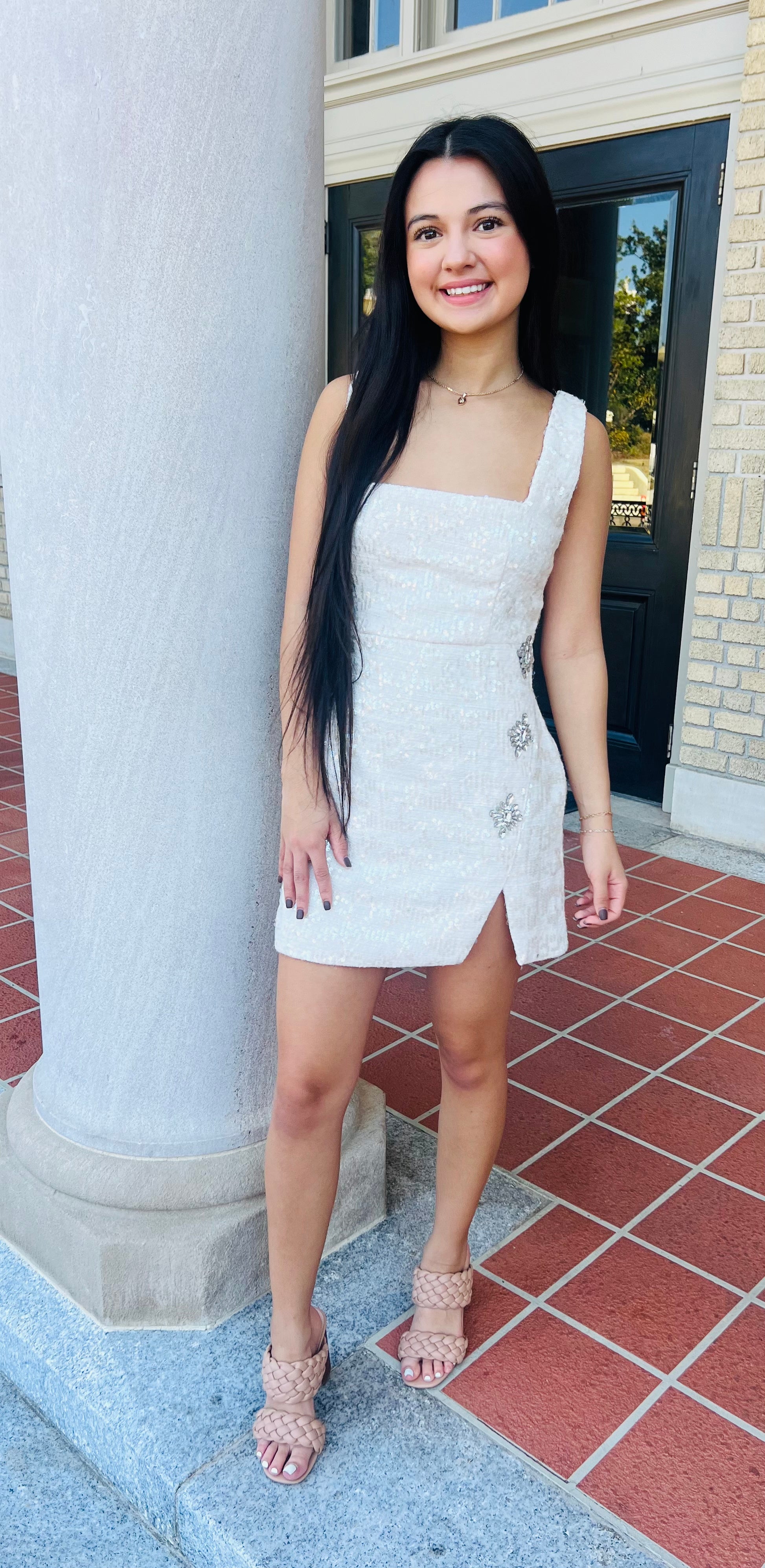 This is a classic cut square neckline with a fitted bodice that zips ip the back. It’s a mini dress and has these gorgeous rhinestone broaches down the side. Very Glamorous.