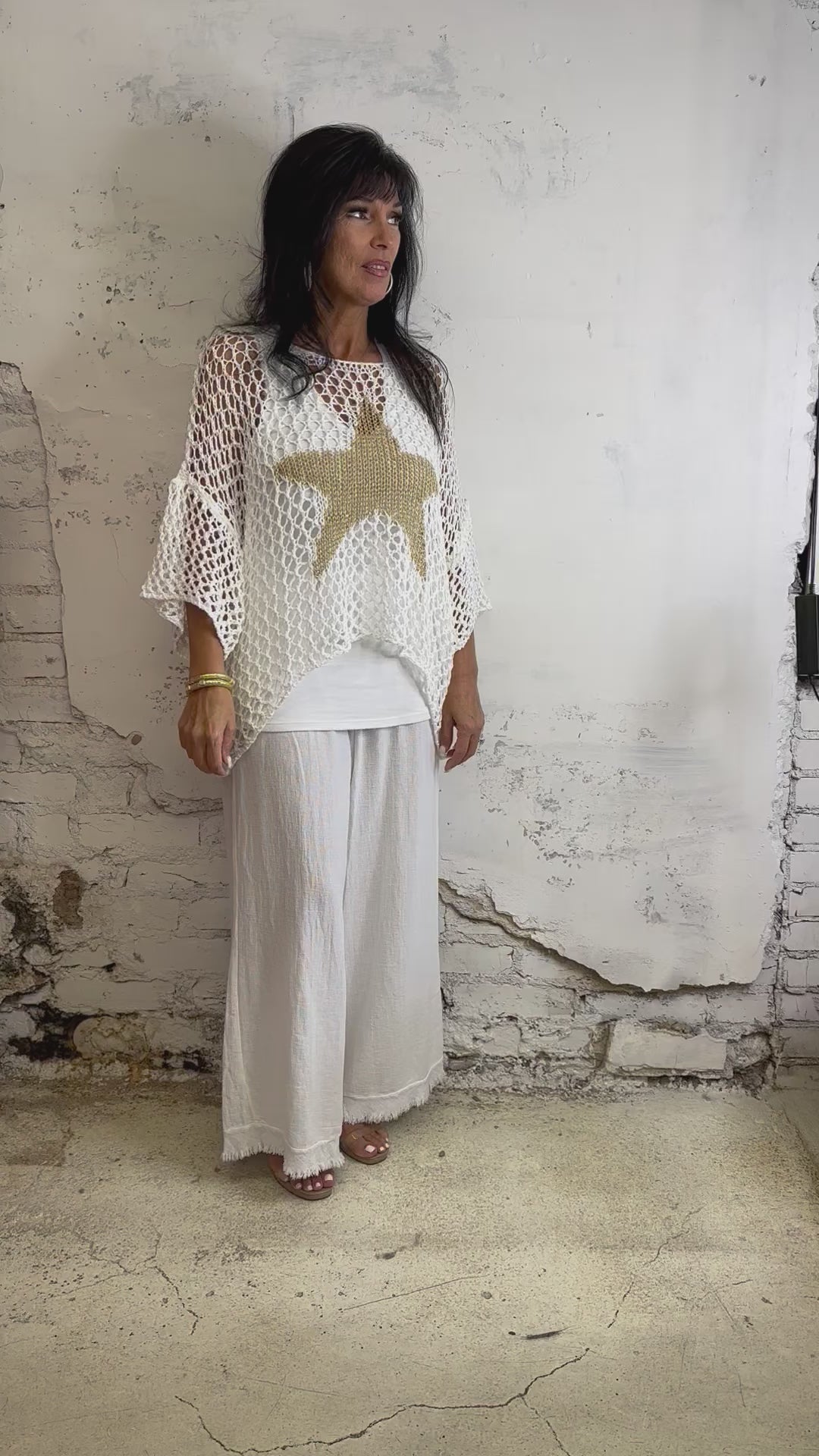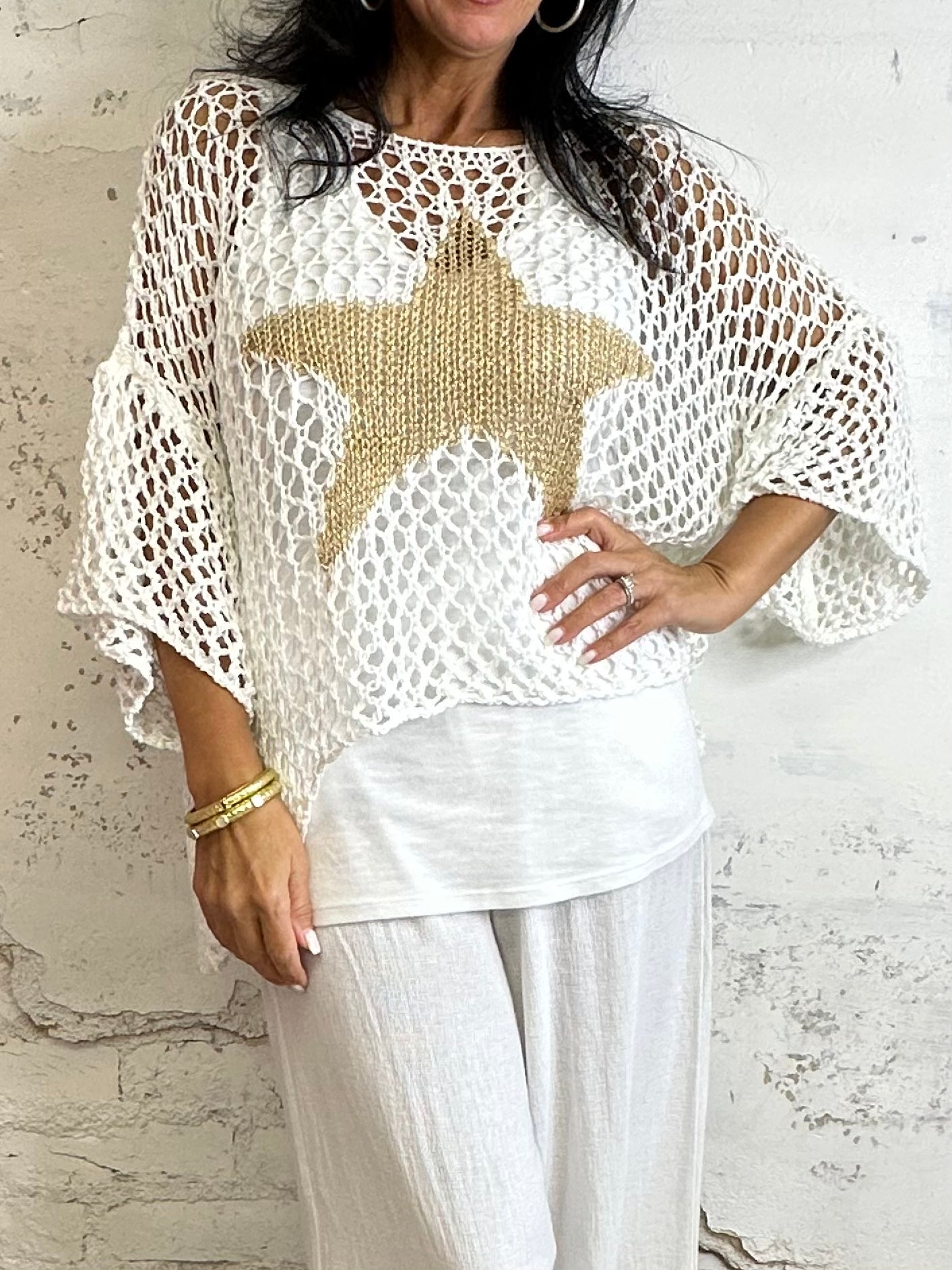 This is a fabulous crochet sweater in white with a large gold star on the front. Soooo cute and fun for summer.