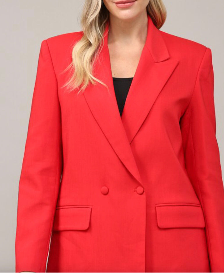 This is a boxy,oversized red blazer. It’s double button closure and is a longer length.